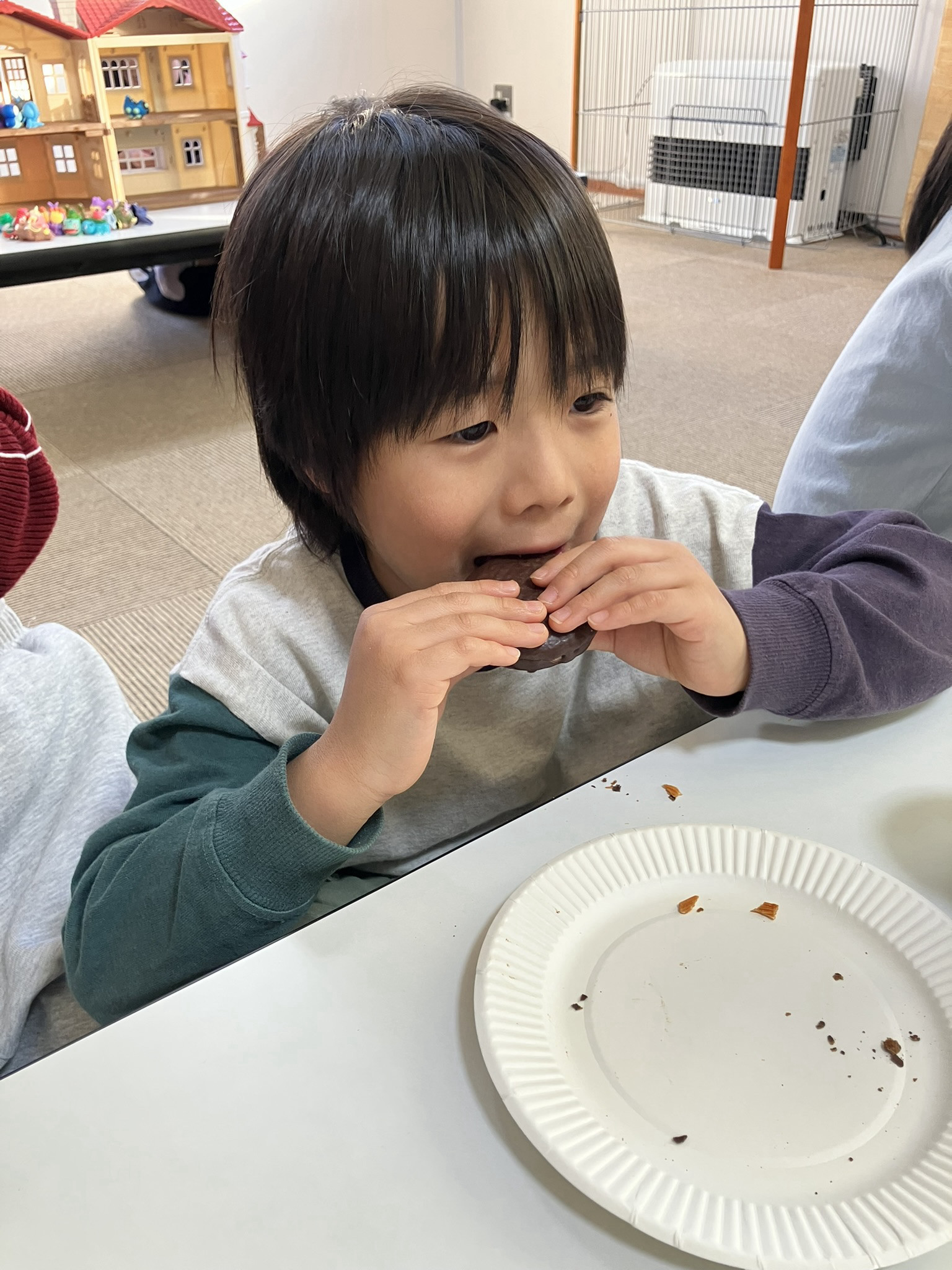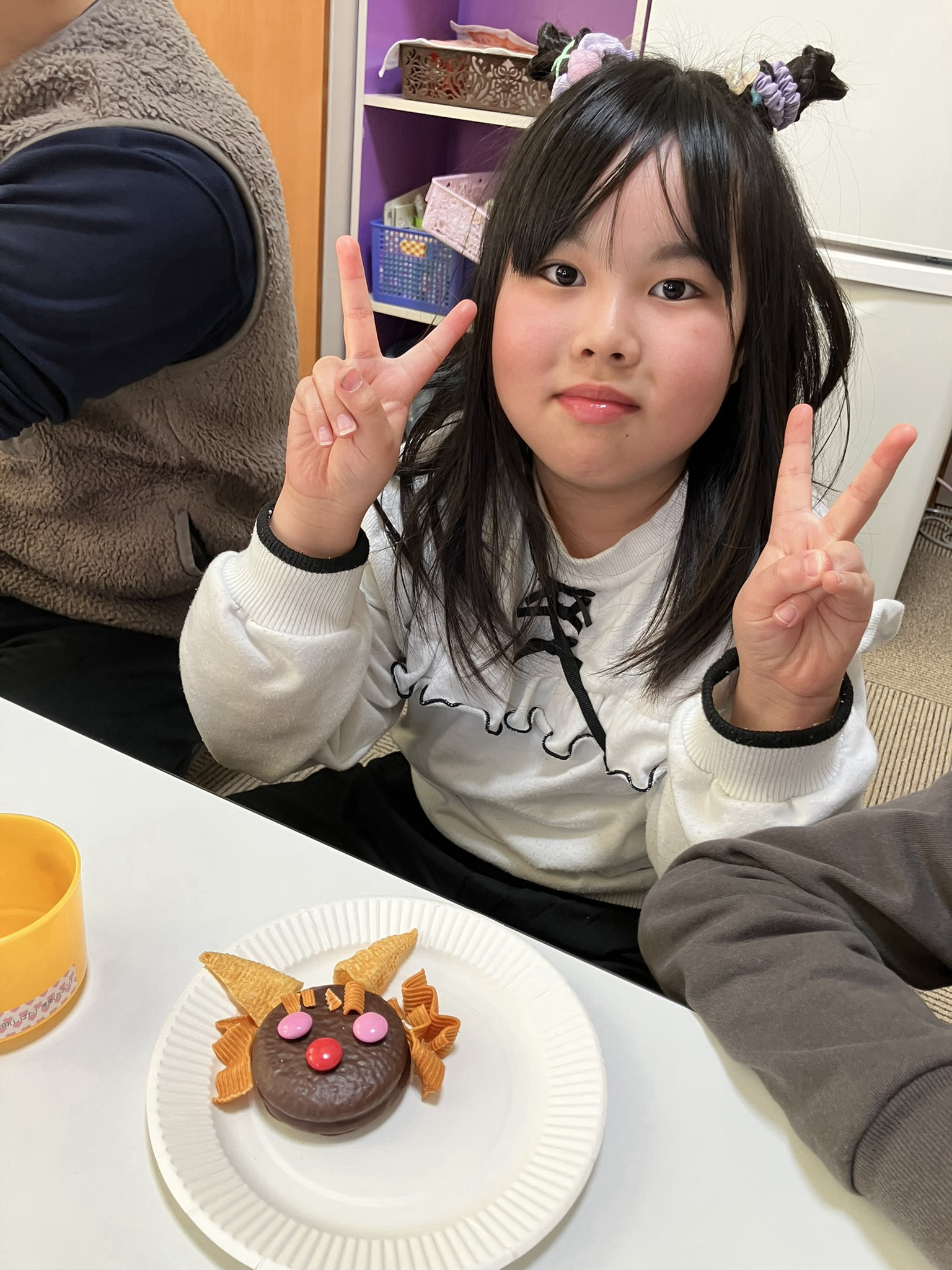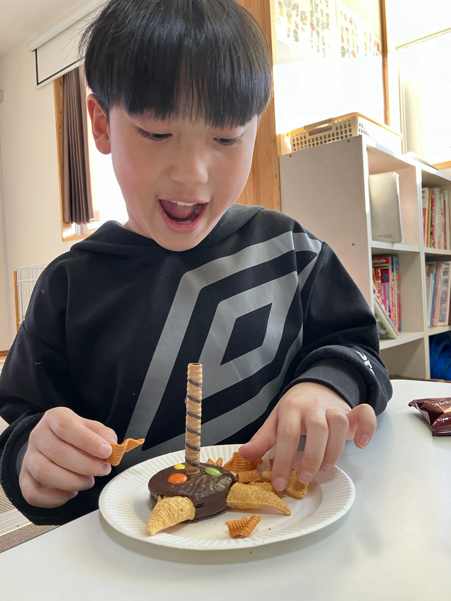 えくぼの節分は、チョコパイをベースに鬼を作り、食べて退治しました。