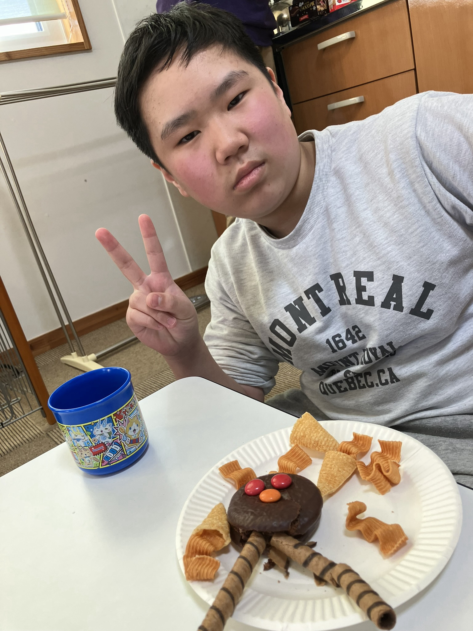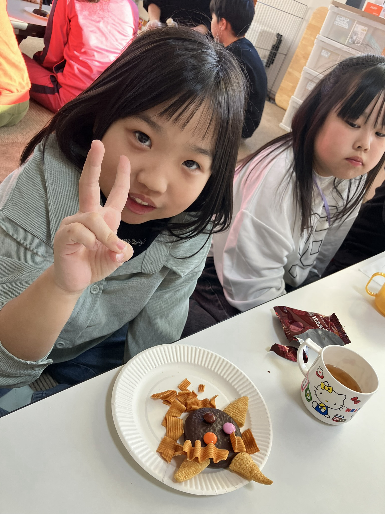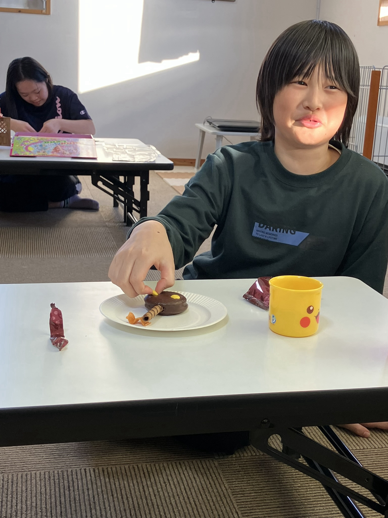 えくぼの節分は、チョコパイをベースに鬼を作り、食べて退治しました。