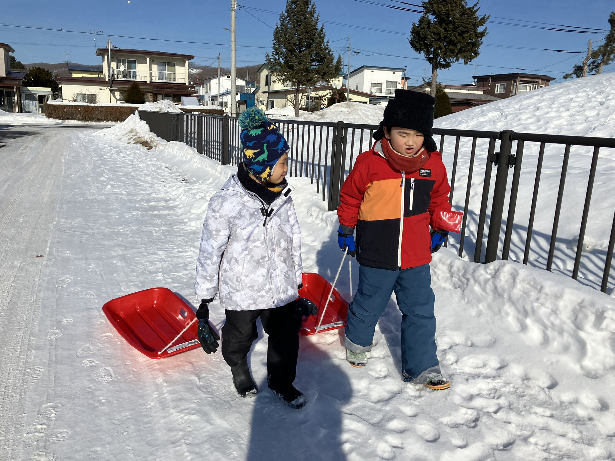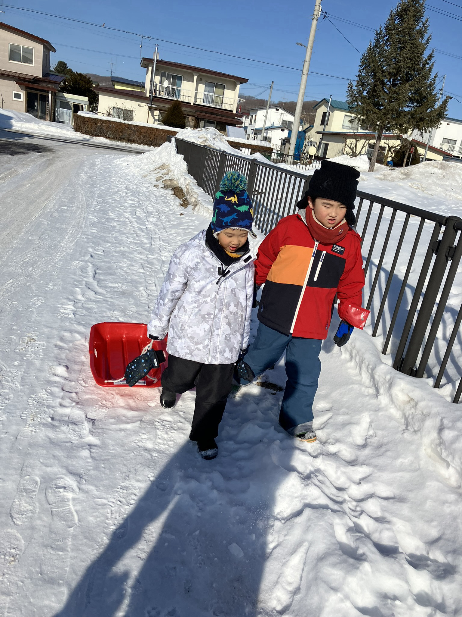 そりを引きながら公園へ向かう子どもたち。とても穏やかな時間が流れています。