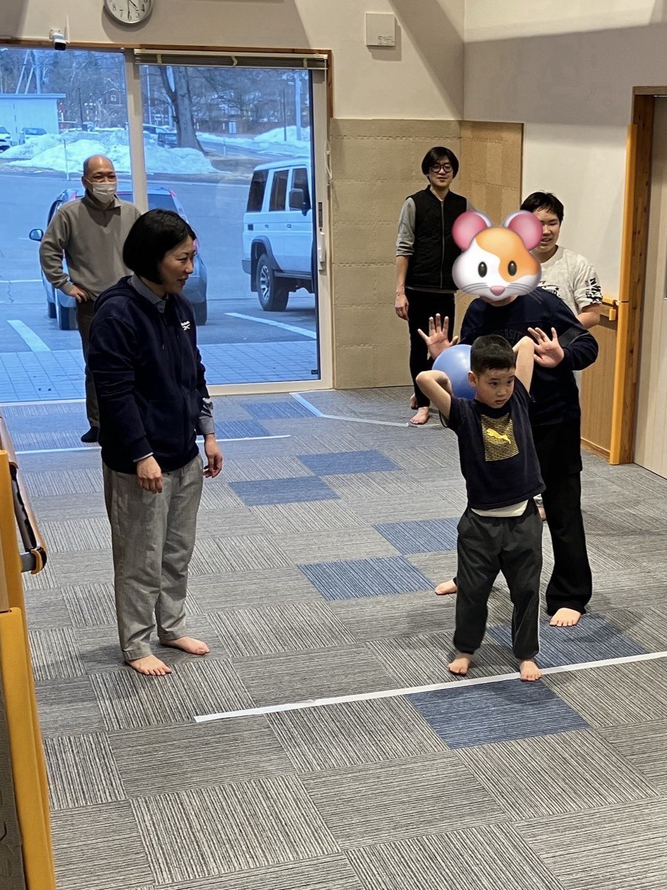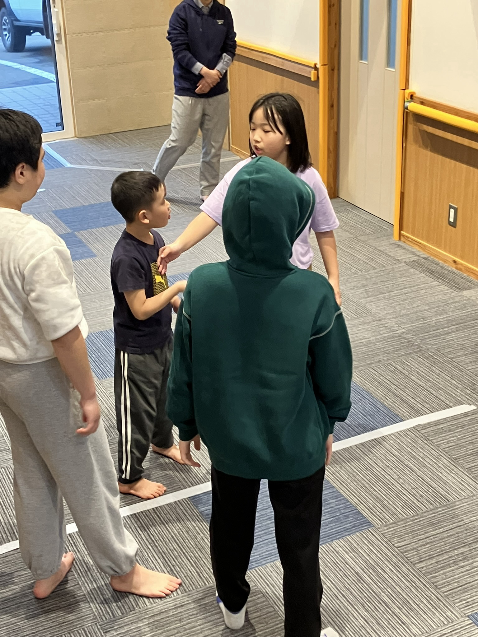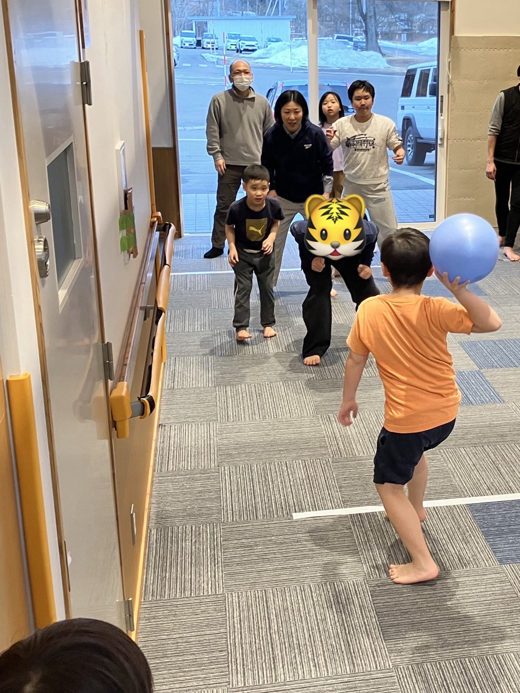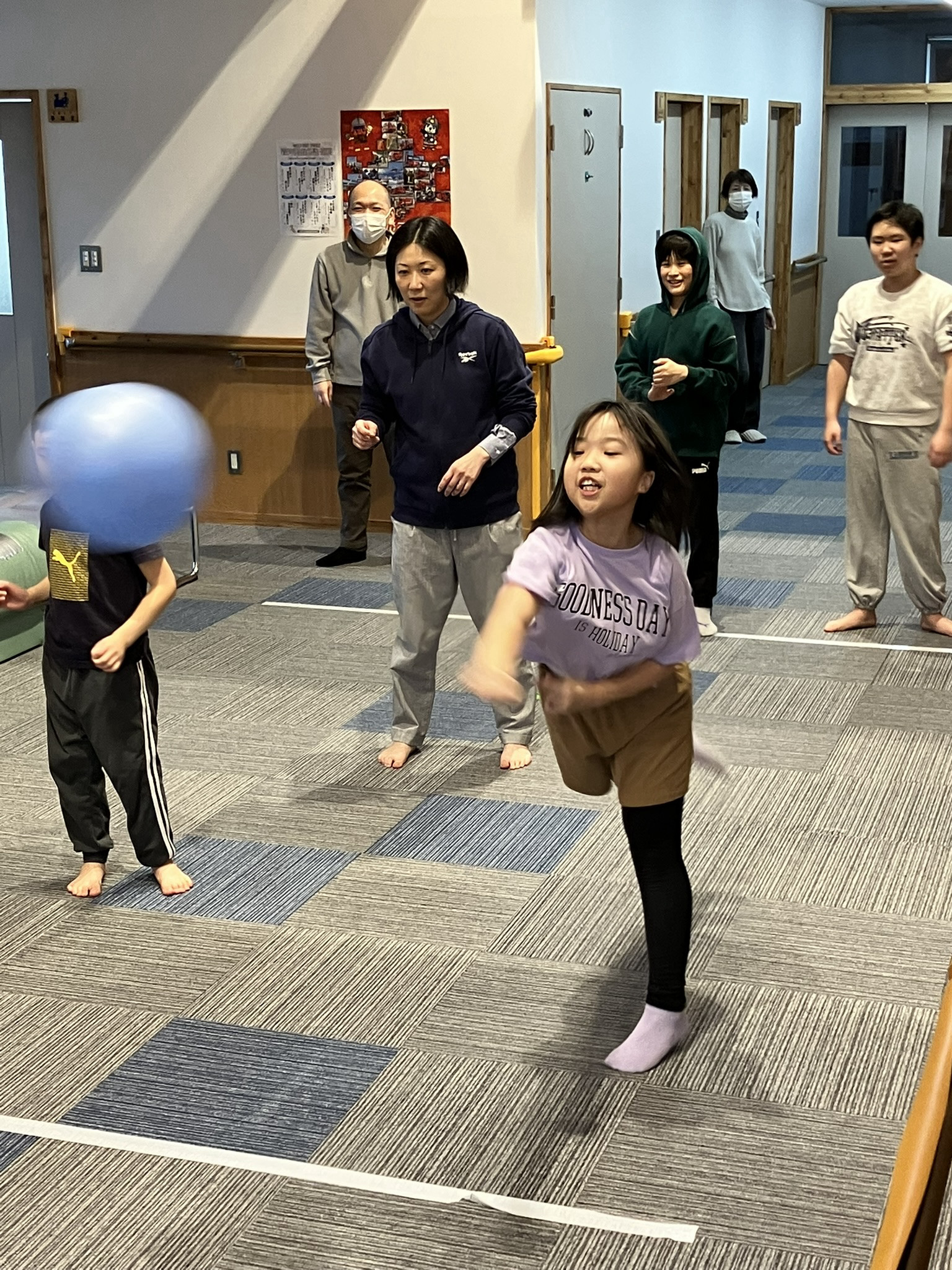 玄関ホールを使用したドッチボール。みんなで、ルールなどを確認しながら楽しんでいます。